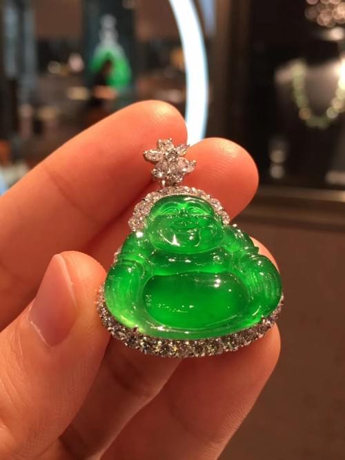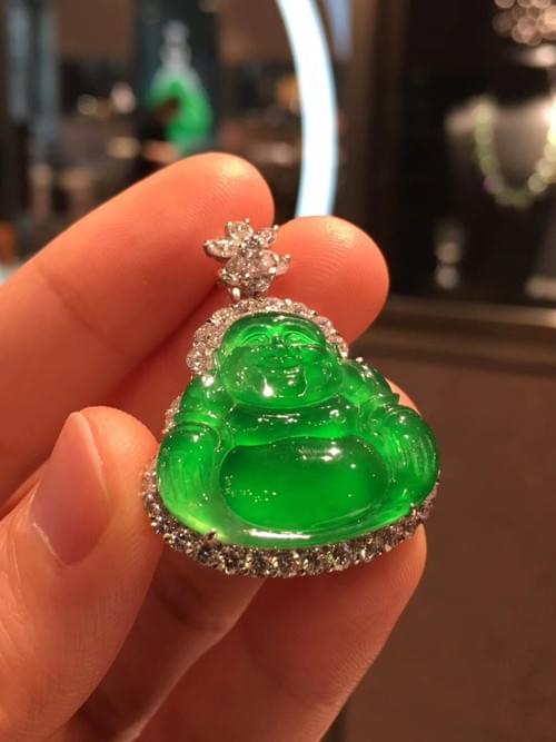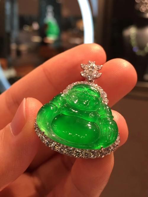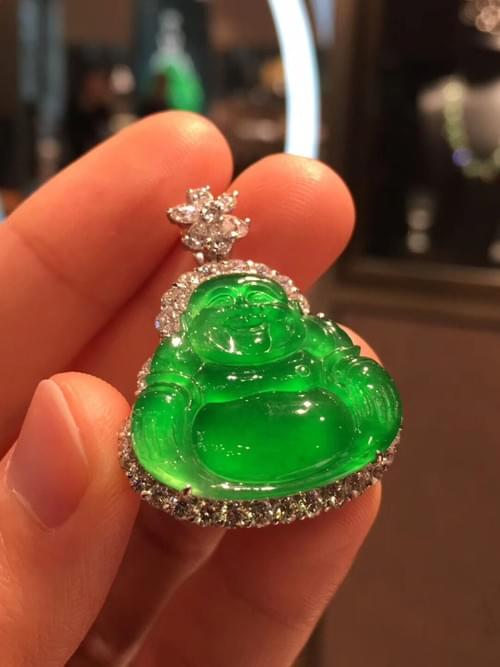 18K金镶嵌玉坠项链挂饰满绿弥勒佛像冰种天然翡翠吊坠