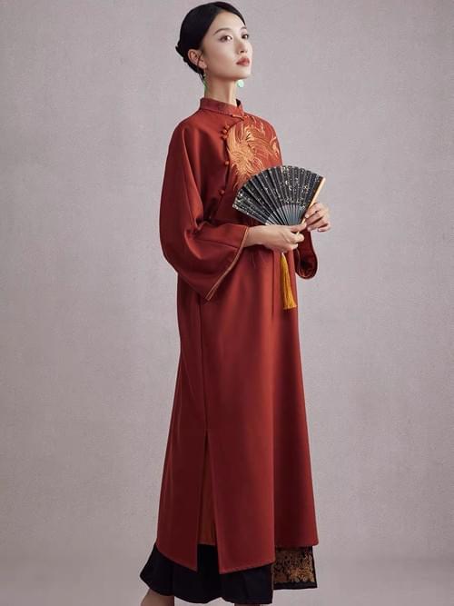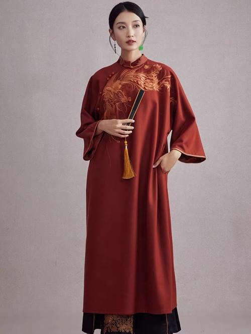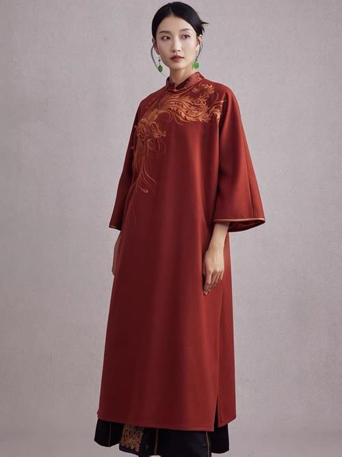 凤凰刺绣毛呢连衣裙秋冬款
