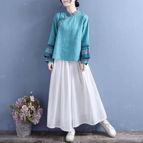 双层刺绣长袖斜襟盘扣棉麻上衣女