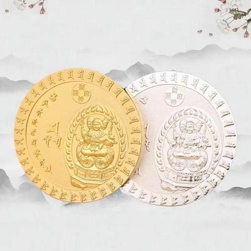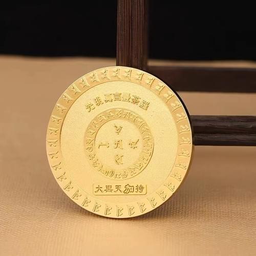 由慈师加持,“大黑天财神招财金币”正面雕刻了三面财神的种子字,旁边雕刻着大黑天财神的心咒,这是具有着招财能量,让人做事具有信心,自然做事事倍功半。背面加入了光明真言曼茶罗的咒轮,代表光明,金银财富都是如法得来。